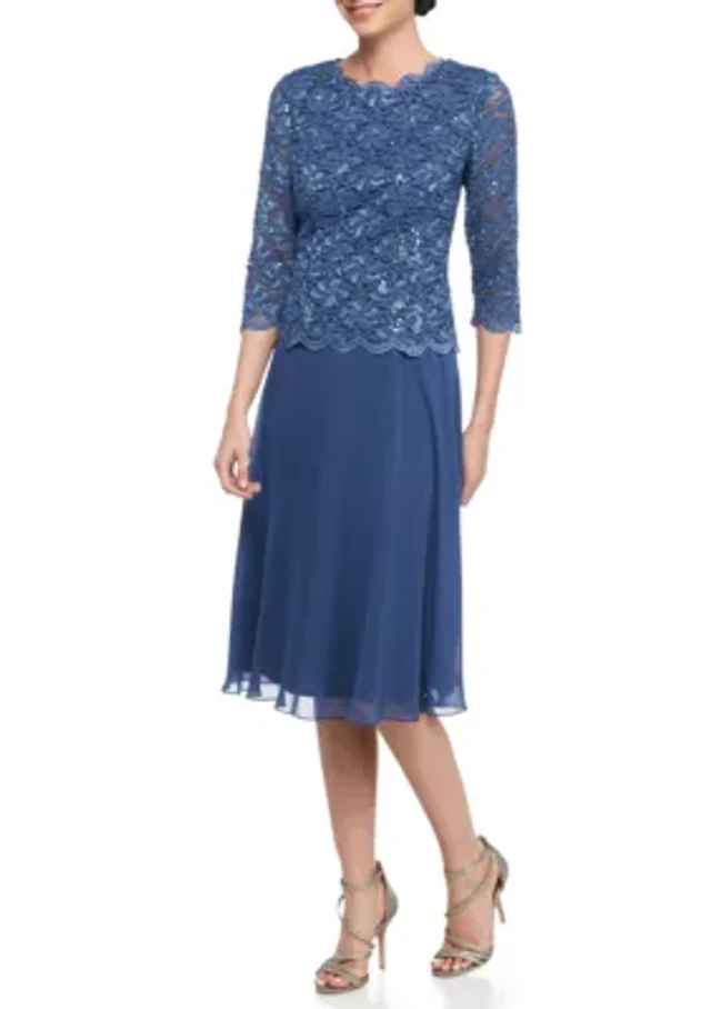 Women's Tea-Length Mock Dress with Sequin Lace Bodice & Chiffon Skirt