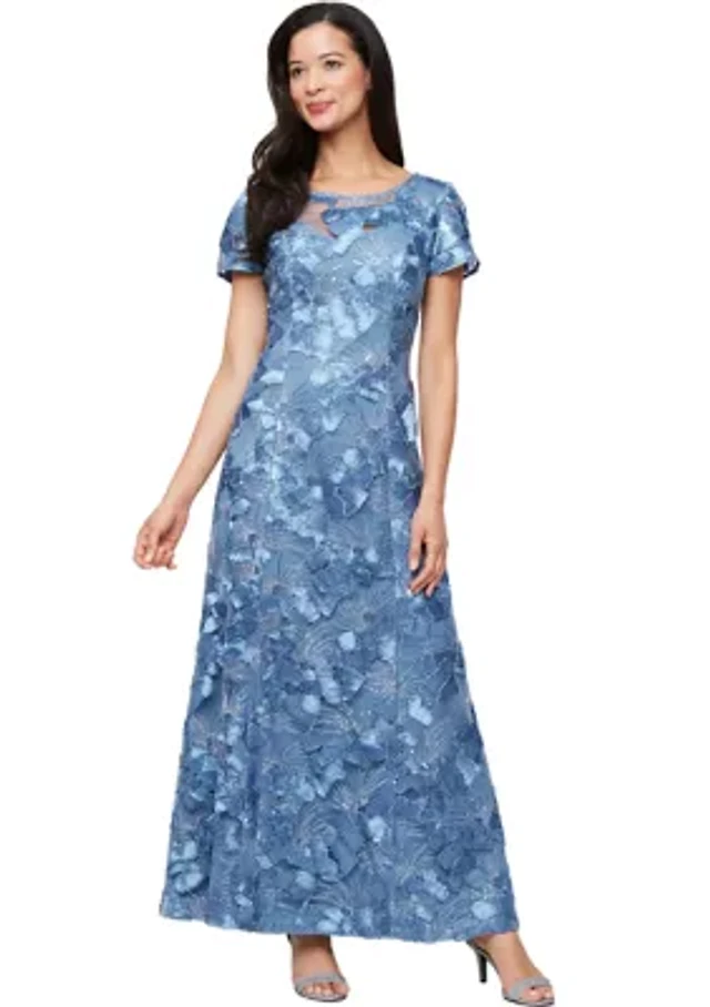 Alex Evenings Stretch Crepe Illusion Neck Soutache Bodice Long Gown