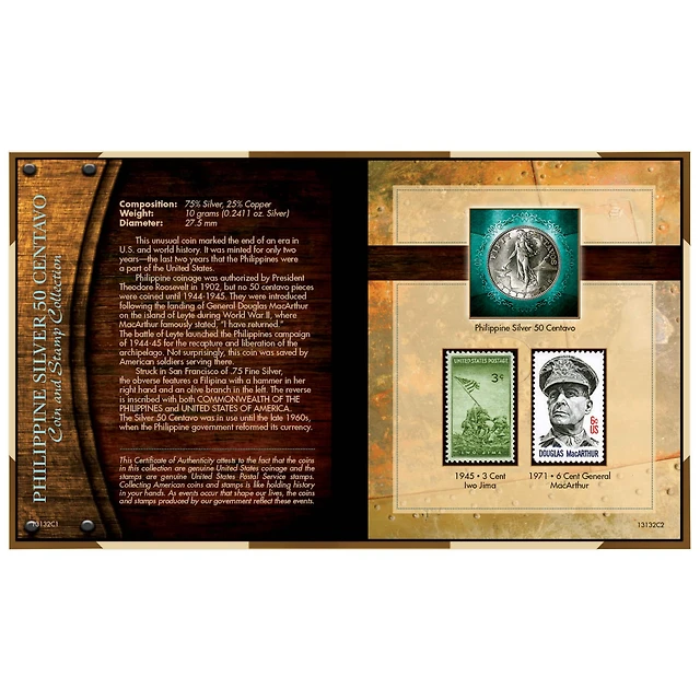 World War II Silver Philippines 50 Centavos Coin & Stamp Collection