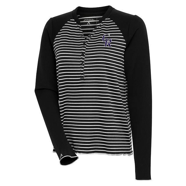 Women's Antigua Black/White Colorado Rockies Maverick Henley Long Sleeve T-Shirt