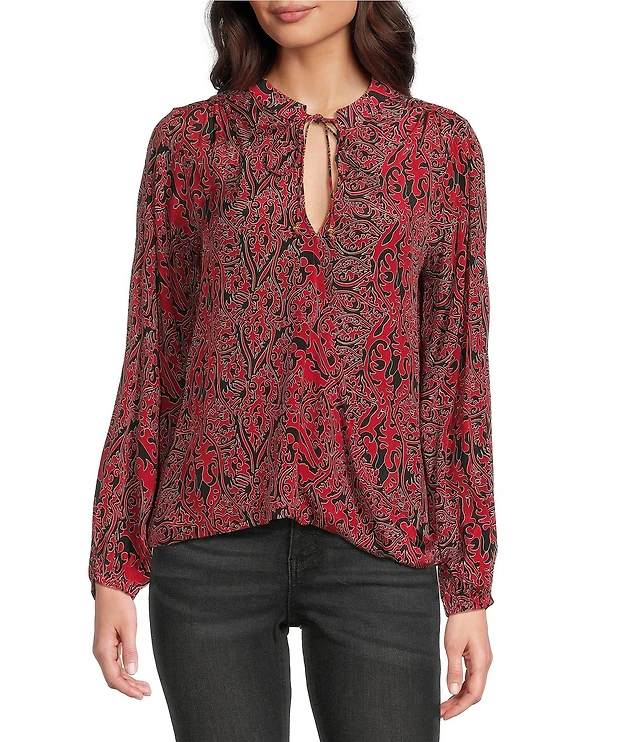 APNY Woven Printed Tassel V-Neck Long Sleeve Top
