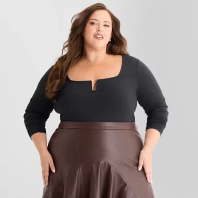 Ashley Graham Wire Notch Womens Plus Scoop Neck Long Sleeve T-Shirt