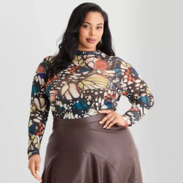 Ashley Graham Mesh Print Womens Plus Mock Neck Long Sleeve T-Shirt
