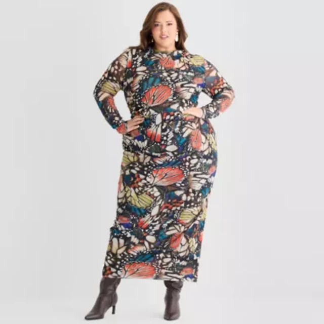 Ashley Graham Mesh Womens Plus Long Sleeve Butterfly Bodycon Dress