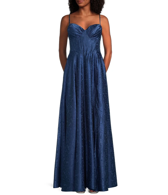 B. Darlin Sleeveless Satin Jacquard Sweetheart Neck Bustier Front Slit Gown