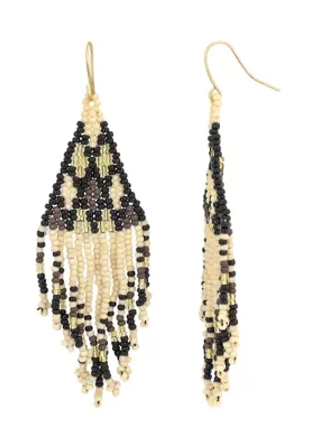 Gold-Tone Black Multi Woven Bead Kite Fringe Drop Earrings