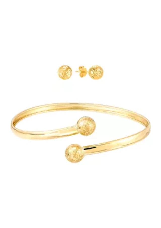 Diamond Cut Bead Bangle and Stud Earrings Set in 10K Yellow Gold