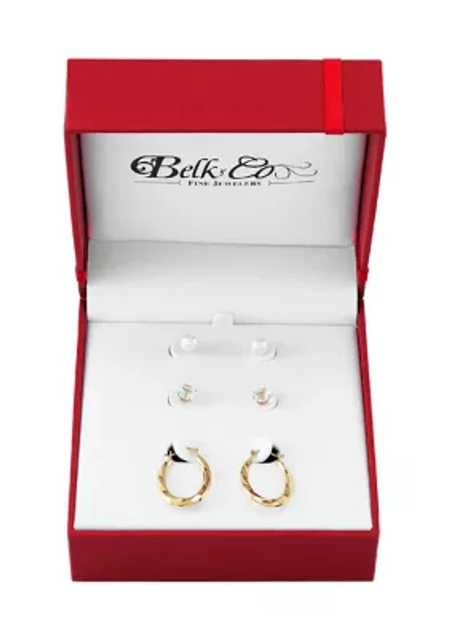 Pearl and White Topaz Hoop and Stud Earring Set in 10K Yellow Gold