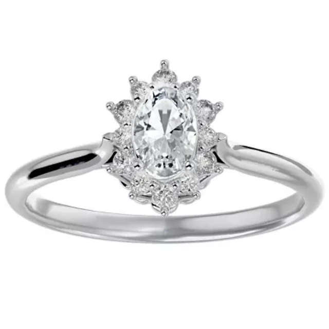 Lab Created /2 ct. t.w. Oval Shape Moissanite and Halo Diamond Ring Sterling Silver