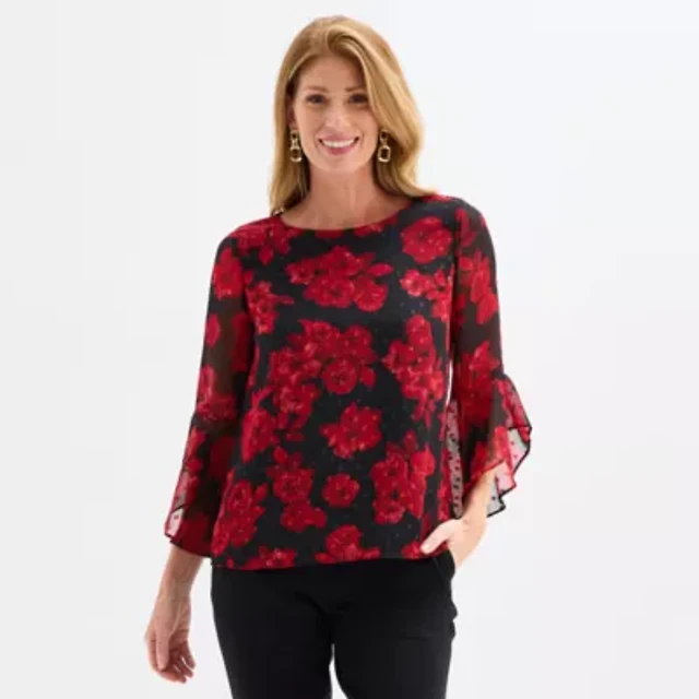Black Label by Evan-Picone Floral Womens Crew Neck 3/4 Sleeve Blouse