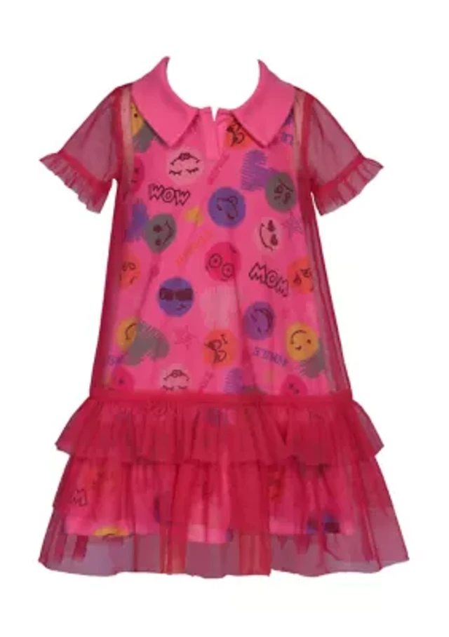 Toddler Girls Short Sleeve Emoji with Mesh Overlay Dress