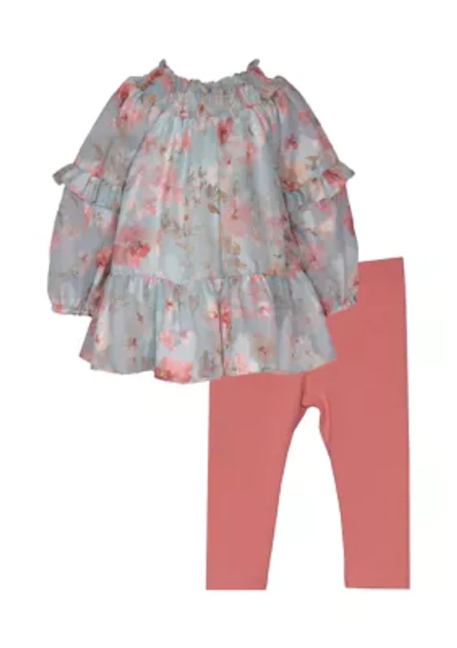 Baby Girls Smocked Printed Chiffon Top and Solid Leggings Set