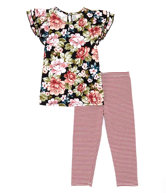 Bonnie Jean Little Girls Floral Print Triple Ruffle Short Sleeve & Stripe Legging 2-Piece Set