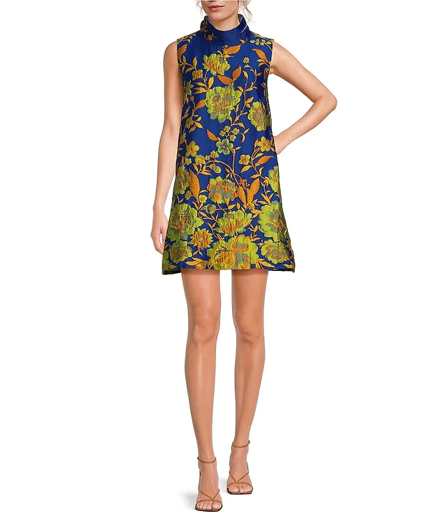 Buru Floral Brocade Mock Neck Sleeveless Shift Mini Dress