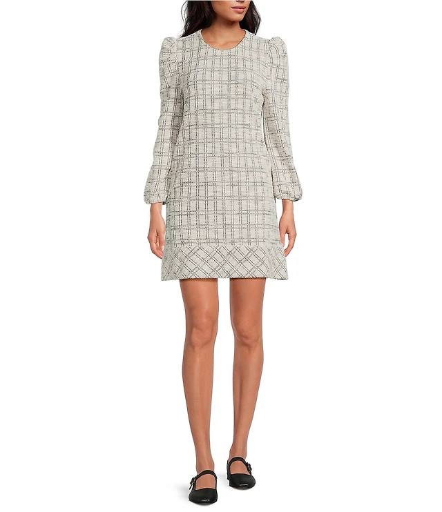 Buru Knit Checker Long Puff Sleeve Shift Mini Dress