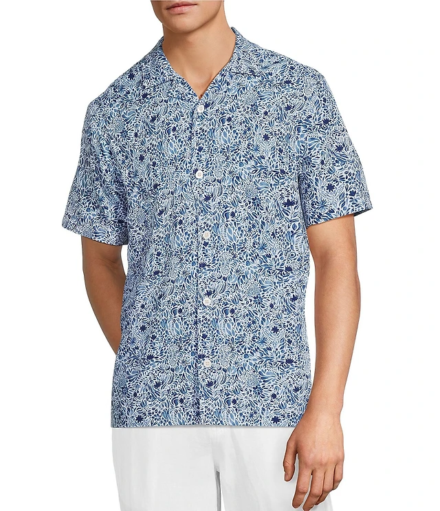 Caribbean Shadow Topical Floral Print Short Sleeve Woven Camp Shirt