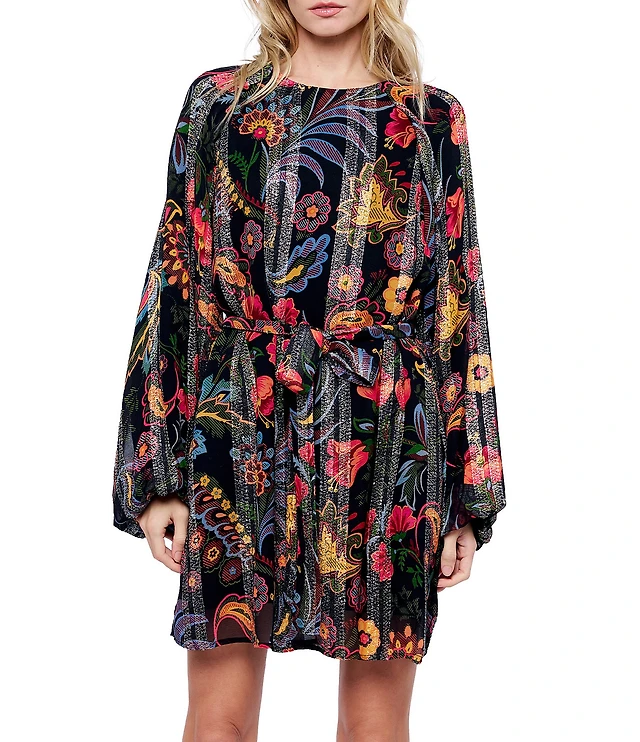 CIEBON Odette Metallic Jacquard Georgette Floral Print Boat Neck Belted Mini Dress
