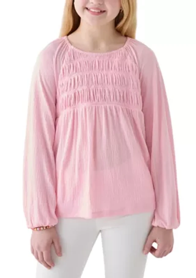Girls 7-16 Long Sleeve Smocked Crinkle Knit Top