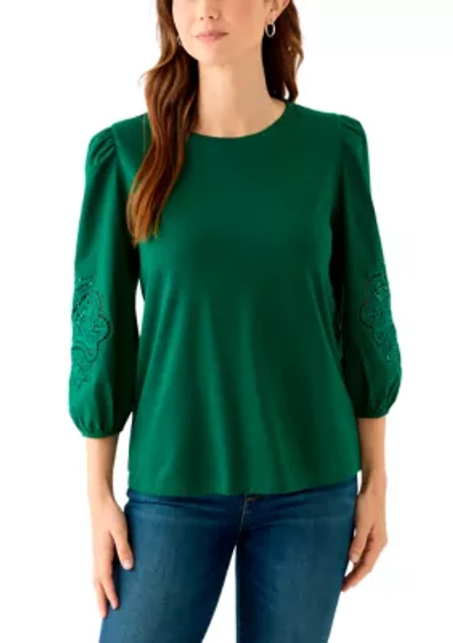 Women's Elbow Sleeve Ribbed Eyelet Top