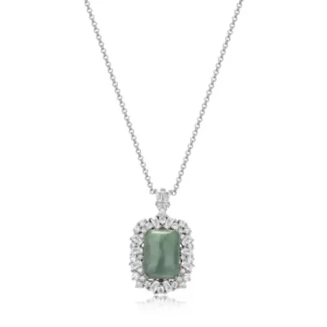 Rhodium Plated Sterling Silver Genuine Jade and Cubic Zirconia Scattered Halo Pendant Necklace