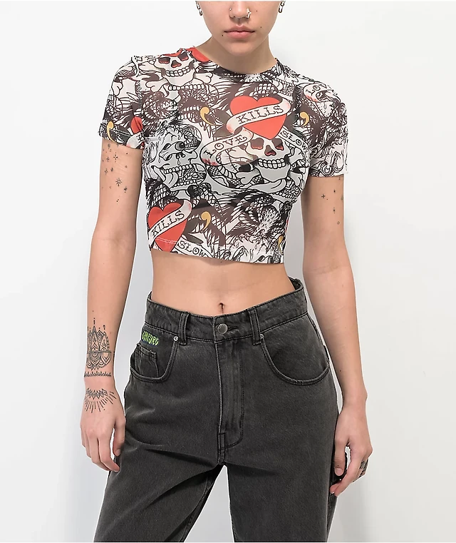 Ed Hardy Dragon Dagger White Mesh Long Sleeve Crop Top