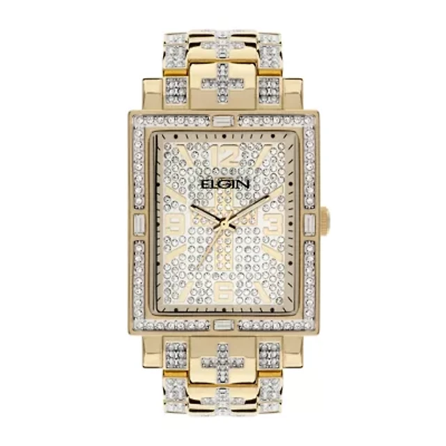 Elgin Mens Crystal-Accent Rectangular Gold-Tone Cross Watch