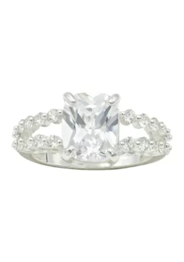 Lab Grown Silver Tone Cushion Cut Sapphire Crystal with Pavé Cubic Zirconia Band Ring