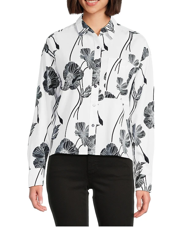 Foxcroft Plus Size Paityn Jacquard Point Collar Long Sleeve Shirttail Hem Button Front Shirt