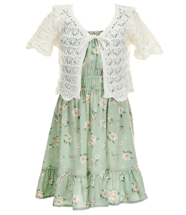I.N. Girl Big Girls Short-Sleeve Novelty-Stitched Crocheted Cardigan & Sleeveless Floral-Printed Fit-And-Flare Dress Set