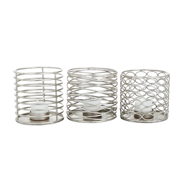 Set of 3 Silver Iron Modern Candle Holders, 4" x 4" x 4"