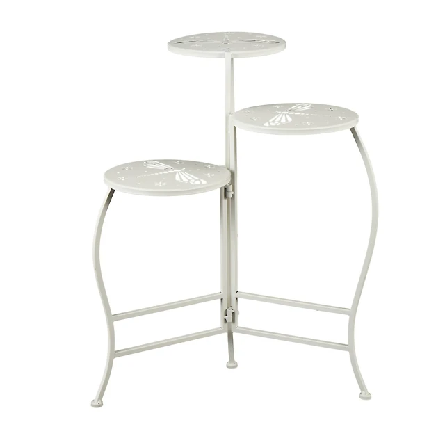 24" White Metal Folding 3-Tier Plant Stand with Dragonfly & Star Cutouts