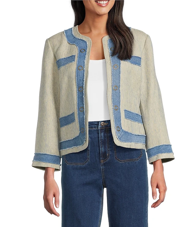 John Mark Open Front Frayed Denim Trimmed Faux Pocket Floral Paisley Lining Tweed Jacket