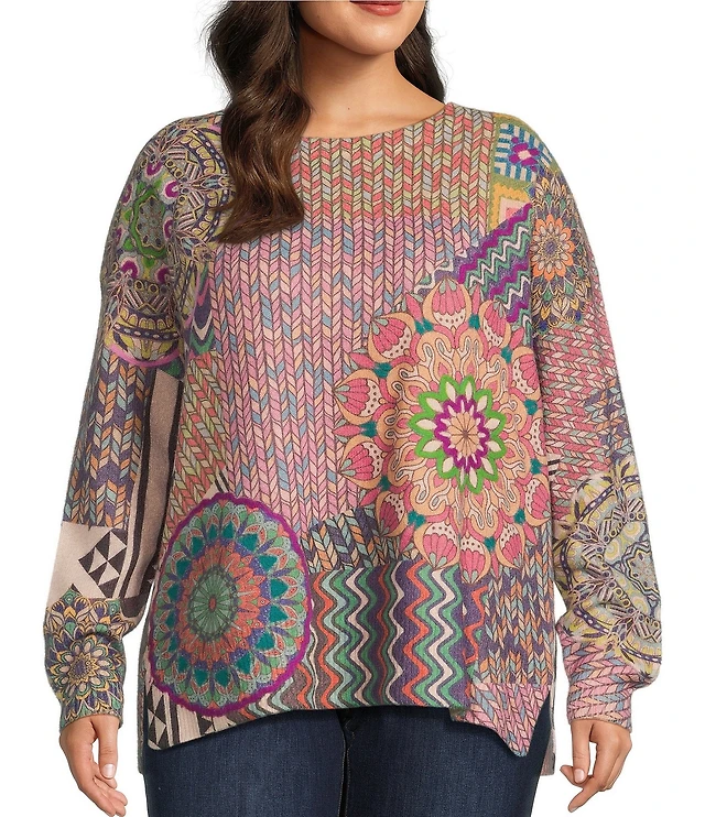 John Mark Plus Size Patchwork Print Crew Neck Long Sleeve Knit Sweater