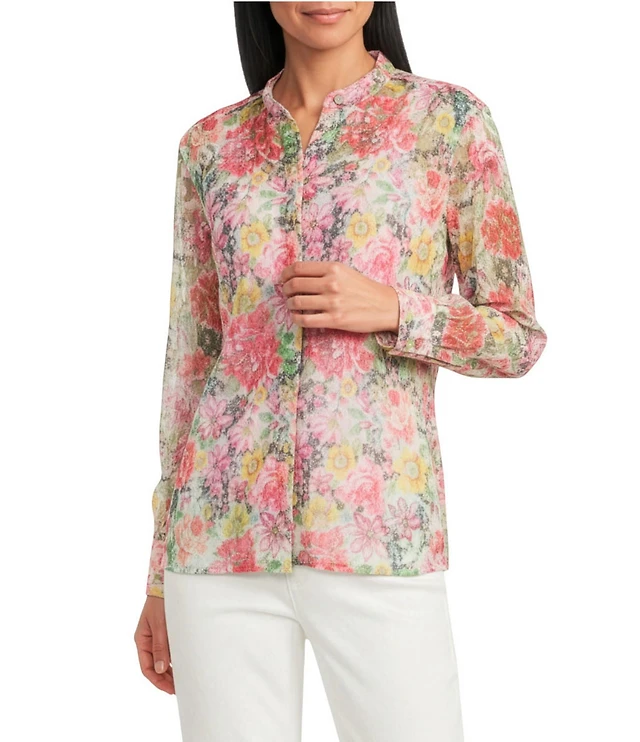 John Mark Abstract Floral Lace Mandarin Collar Long Sleeve Front Button Placket Shirt