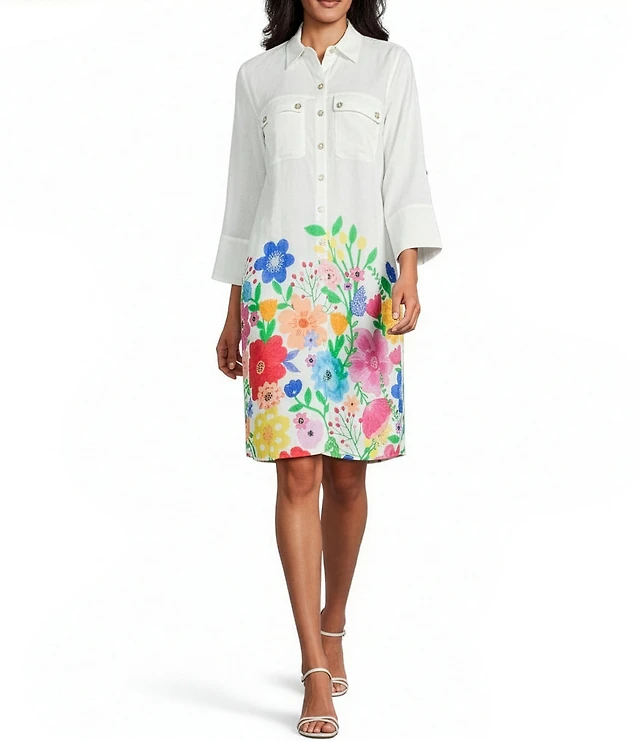 John Mark Petite Size Linen Blend Woven Multi Floral Border Print Point Collar Long Roll-Tab Sleeve Midi Shirt Dress