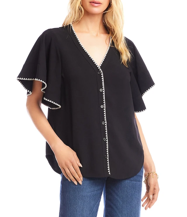 Karen Kane Petite Size V-Neck 3/4 Lantern Sleeve Button-Front Satin Top