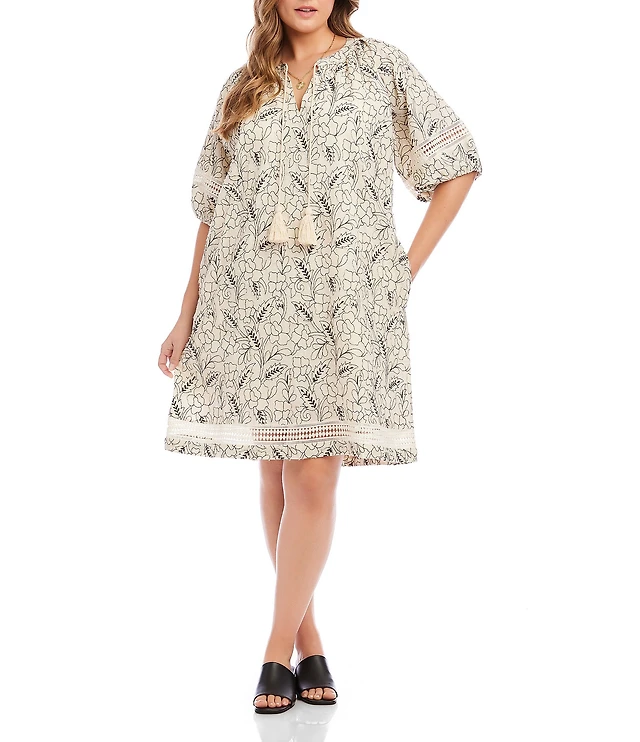 Karen Kane Plus Size Floral Split V-Neck Short Puff Sleeve Tassel Ties Shift Dress