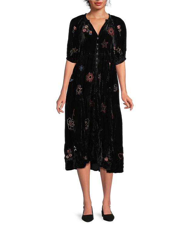 Karyn Seo Jolene Crinkled Velvet Doodle Embroidered V-Neck Short Sleeve Button Front Midi Dress