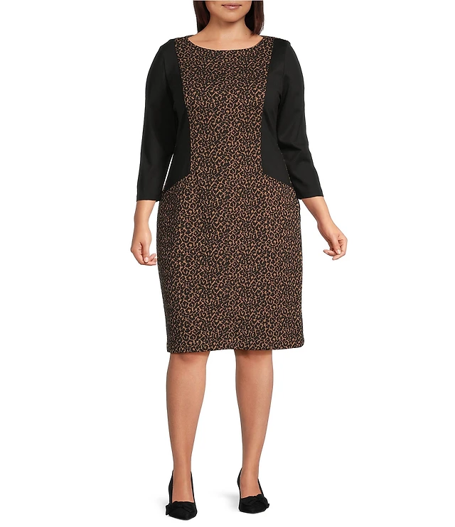 Kasper Plus Size Knit Jacquard Leopard Print Boat Neck 3/4 Sleeve Sheath Dress