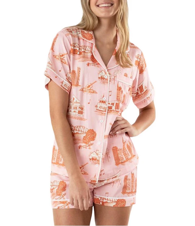 Katie Kime Woven Houston Toile Print Short Sleeve Notch Collar Shorty Pajama Set