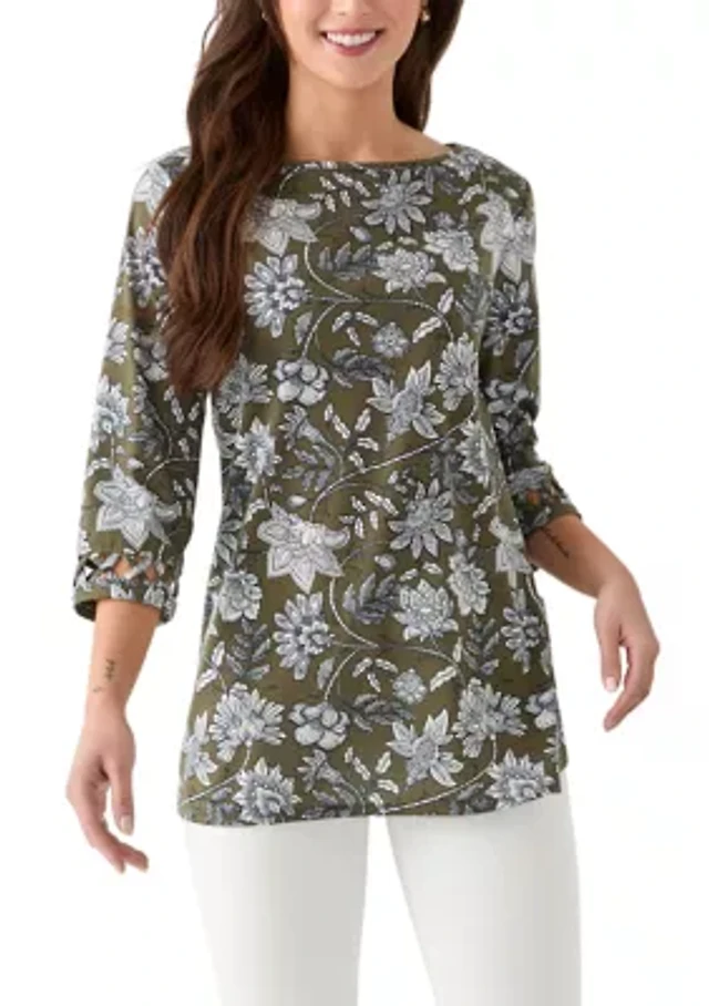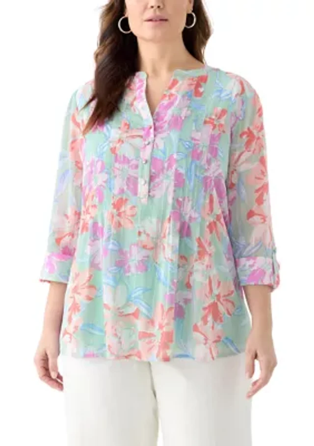 Plus 3/4 Sleeve Keyhole Neck Floral Sharkbite Tunic