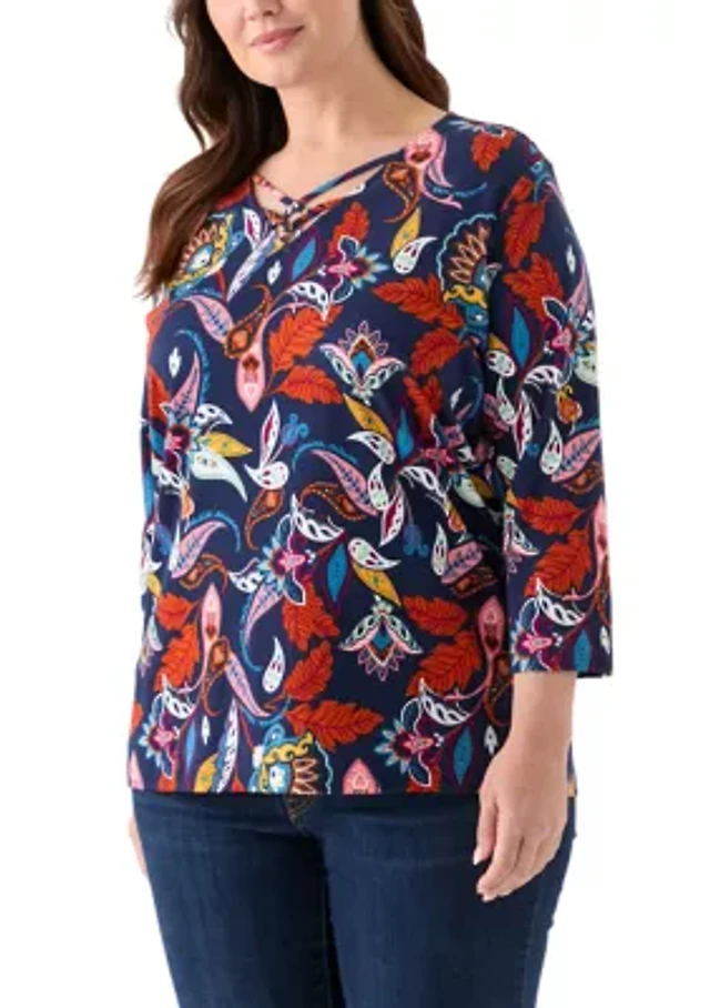Plus Long Sleeve Printed Peasant Top