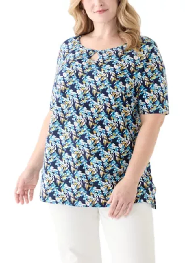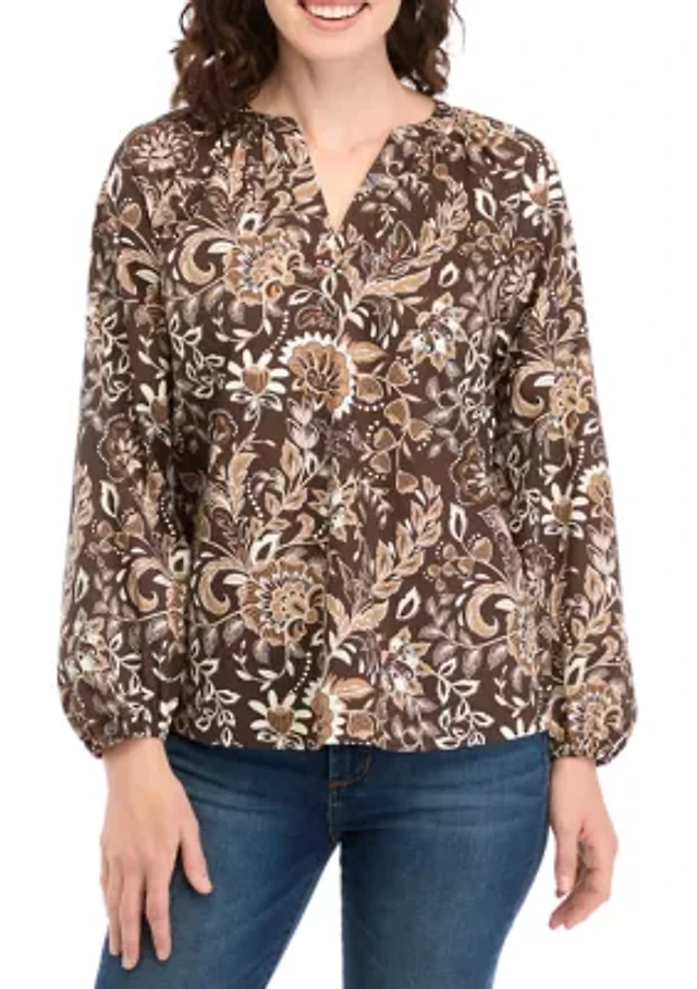 Petite Long Sleeve Split Neck Printed Peasant Top