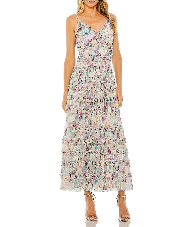 Mac Duggal Sleeveless High Neck Lattice Ruffle Floral Midi Dress
