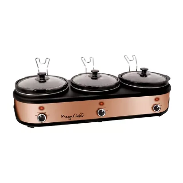 MegaChef Brushed Silver & Black Finish Triple 2.5qt. Slow Cooker & Buffet Server With 3 Ceramic Cooking Pots & Removable Lid Rests