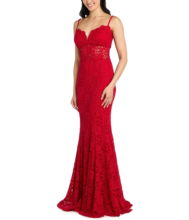 Morgan & Co. Glitter Lace Sweetheart Neck Illusion Corset Keyhole Back Dress