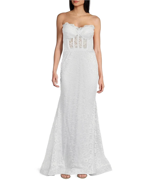 Morgan & Co. Strapless Glitter Illusion Lace Corset Long Dress