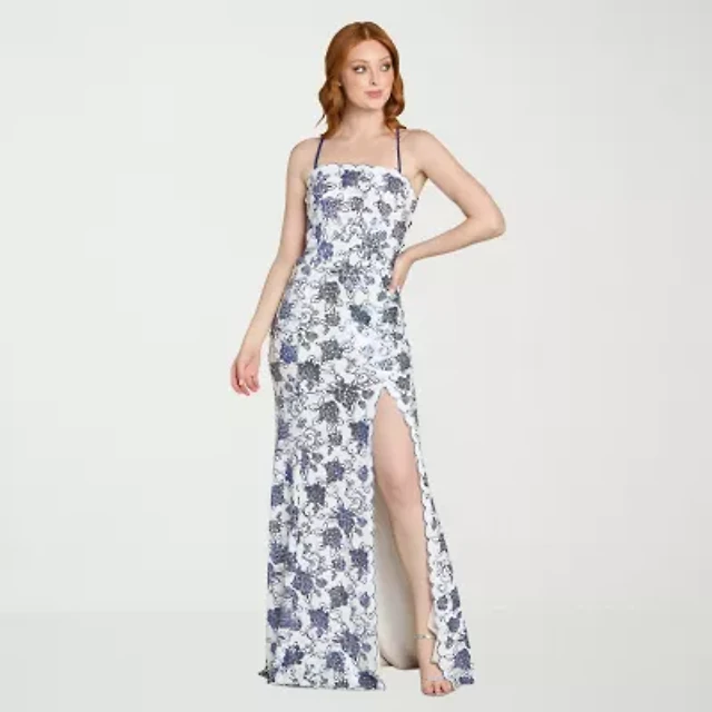Morgan & Co. Floral Sequin Printed Scalloped Lace Up Long Dress
