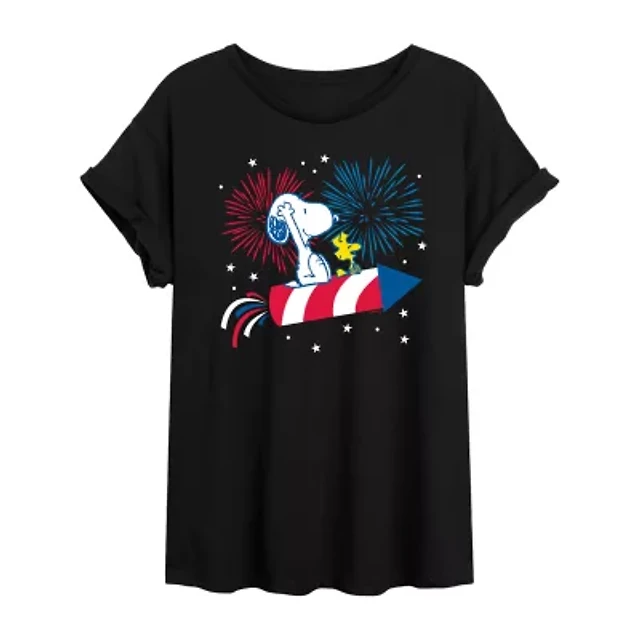 Snoopy And Woodstock Firecracker Womens Juniors Crew Neck Short Sleeve Regular Fit Peanuts Graphic T-Shirt