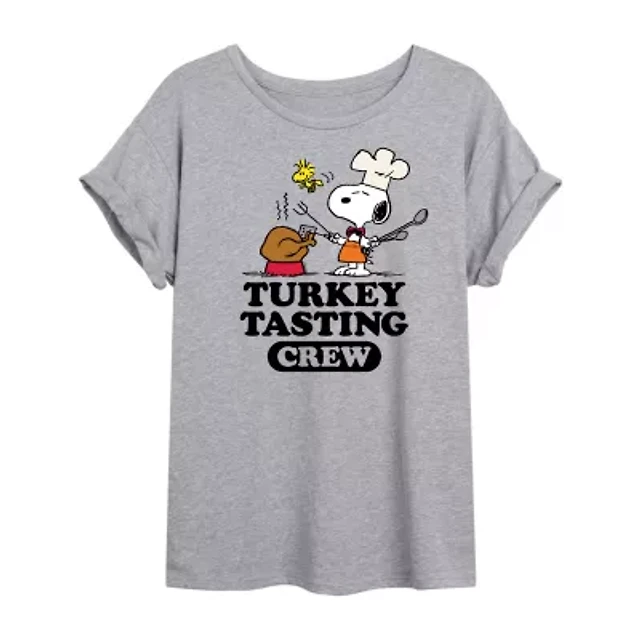 Snoopy Turkey Tasting Womens Juniors Crew Neck Short Sleeve Regular Fit Peanuts Graphic T-Shirt